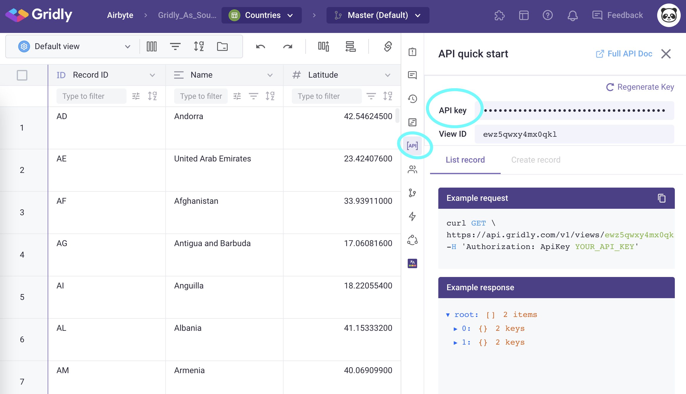 - To quickly get your API key, access your Gridly Dashboard, then select a Grid View and you can find the key in API quick start right panel.